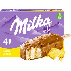 Glace saveurs beurre et vanille avec une préparation aux biscuits au beurre (9,5%) enrobée de chocolat au lait Milka (lait des Alpes) (29%) avec des morceaux de biscuits au beurre.