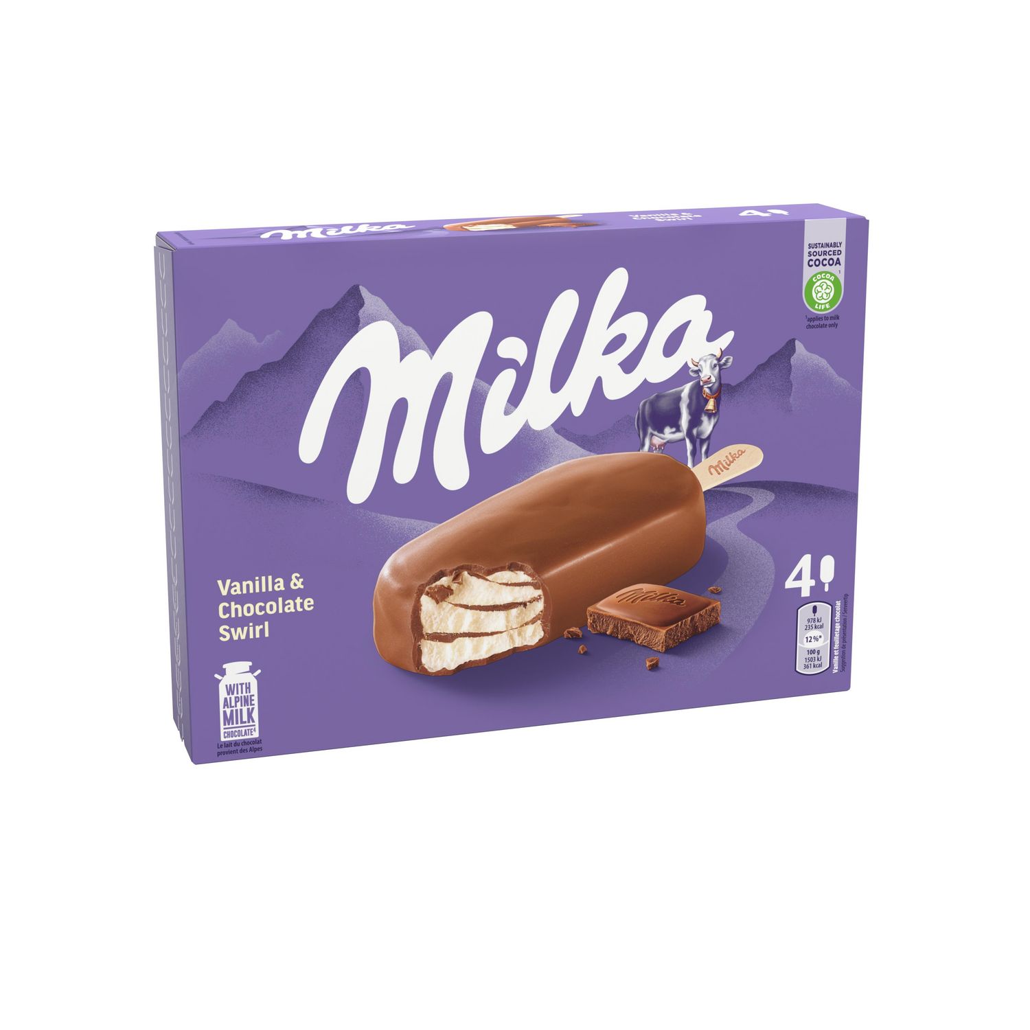 Fondez de plaisir pour le bâtonnet glacé Milka vanille & chocolat: une glace onctueuse à la vanille avec un feuilletage au chocolat craquant et un tendre enrobage au véritable chocolat au lait Milka
