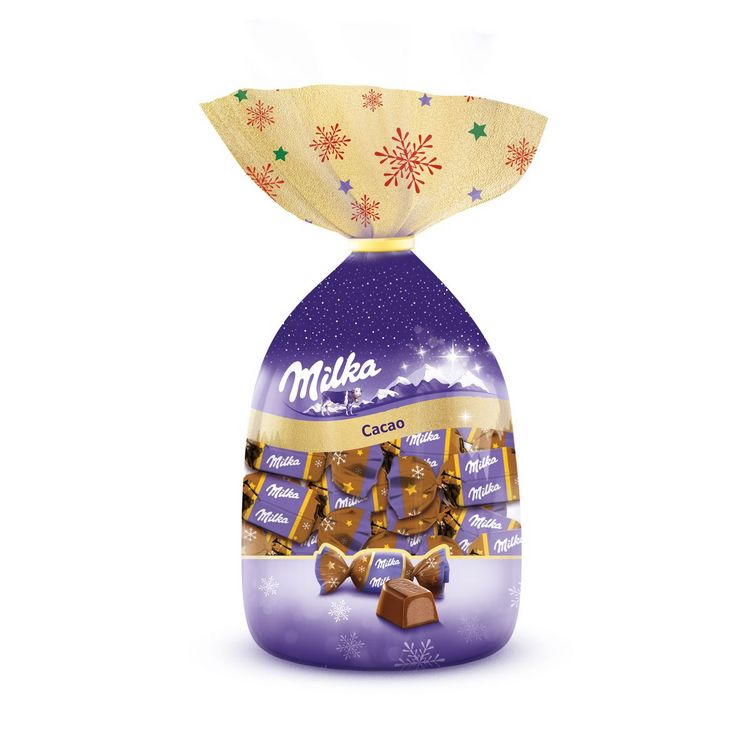 Chocolat au lait du pays alpin fourré crème confiseur (38%) au cacao.