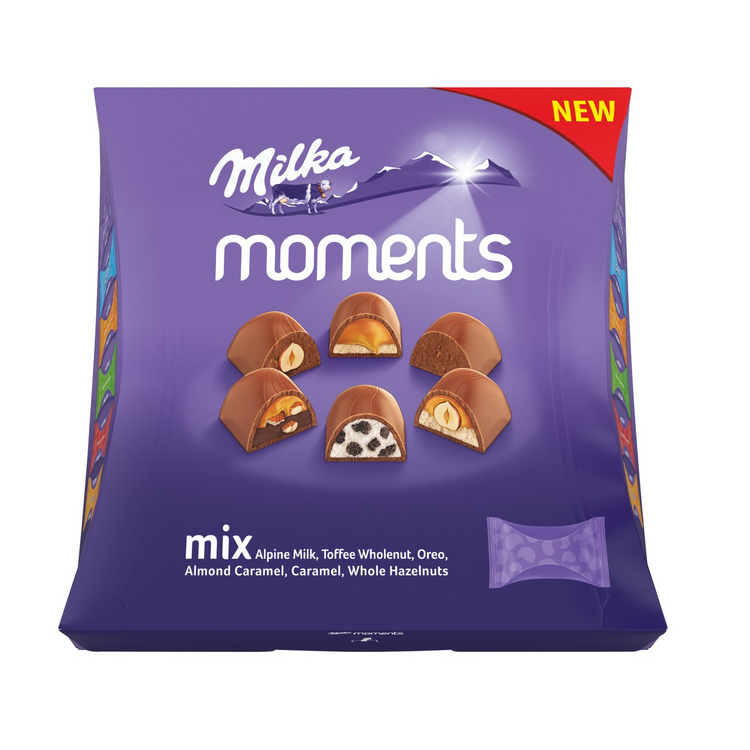 Assortiment de : chocolats au lait du pays alpin, chocolats au lait du pays alpin avec noisette entière (8,5 %), chocolats au lait du pays alpin fourrages saveur caramel (26 %), caramel (9 %) et noisette entière (9 %), chocolats au lait du pays alpin fourrages saveur caramel (25 %) et caramel (20 %), chocolats au lait du pays alpin fourrés (29 %) crème confiseur au lait et morceaux de biscuits cacaotés (10 %).