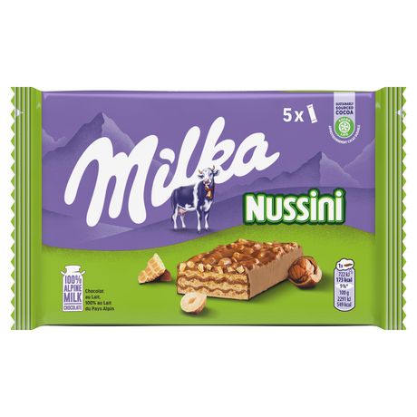 Découvrez Milka Nussini, une gaufrette croustillante recouverte de noisettes et enrobée de délicieux chocolat au lait Milka, pour des pauses gourmandes.