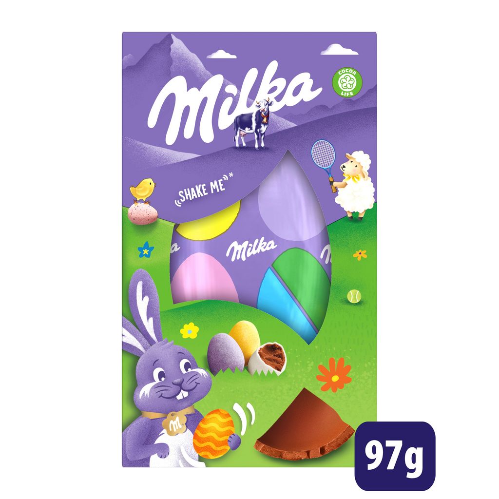 Oeuf en chocolat au lait du pays alpin, garni de mini oeufs dragéifiés (22,5 %) au chocolat au lait du pays alpin.