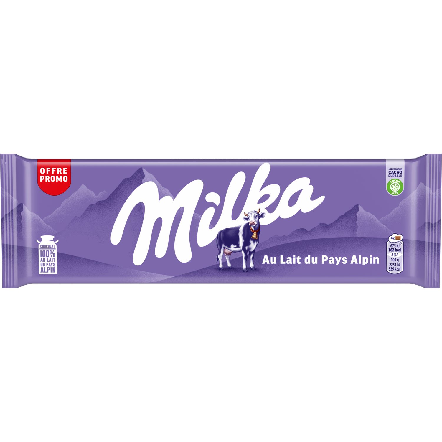 Lait 100% issu du Pays Alpin : Milka travaille en collaboration avec 800 fermiers issus de petites exploitations familiales. Chaque fermier ne s’occupe que de 60 vaches environ, ce qui leur permet de leur porter toute l’attention nécessaire.