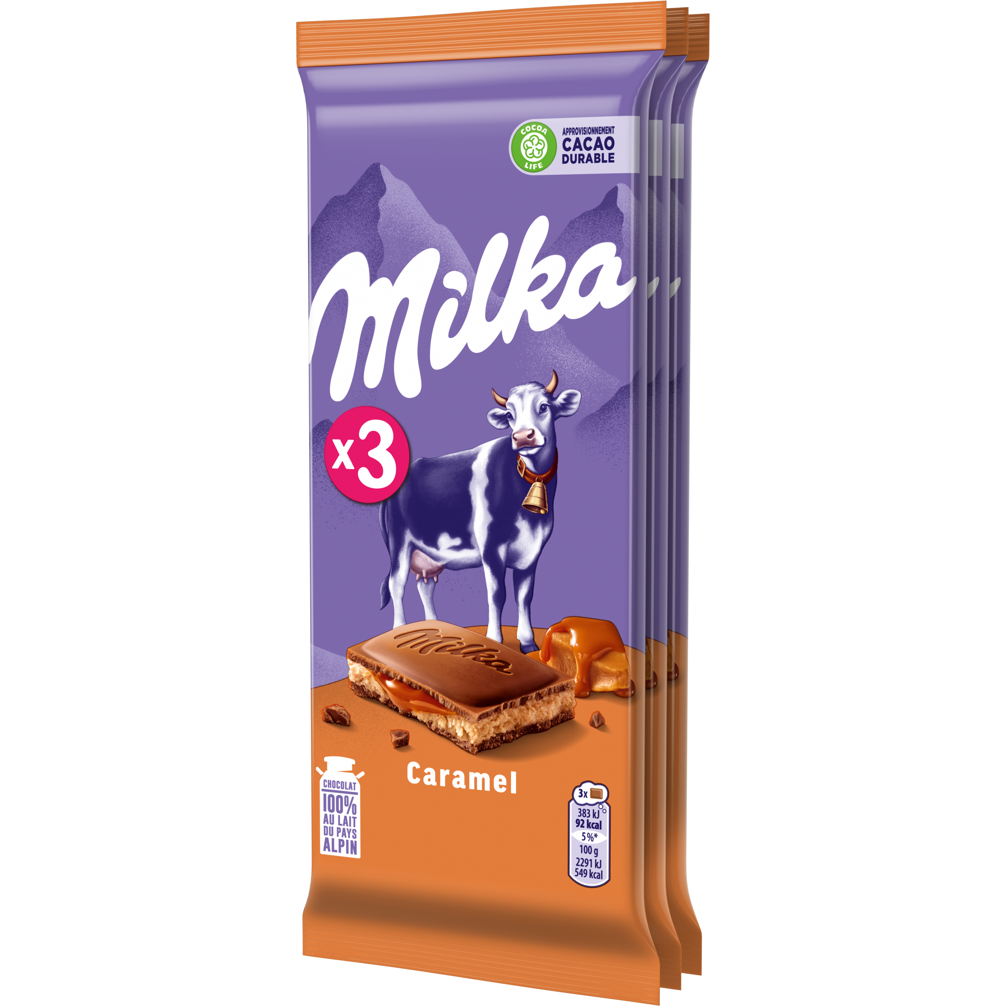 Chocolat au lait du pays alpin fourré crème confiseur (35 %) au lait goût caramel et crème confiseur (15 %) au caramel.