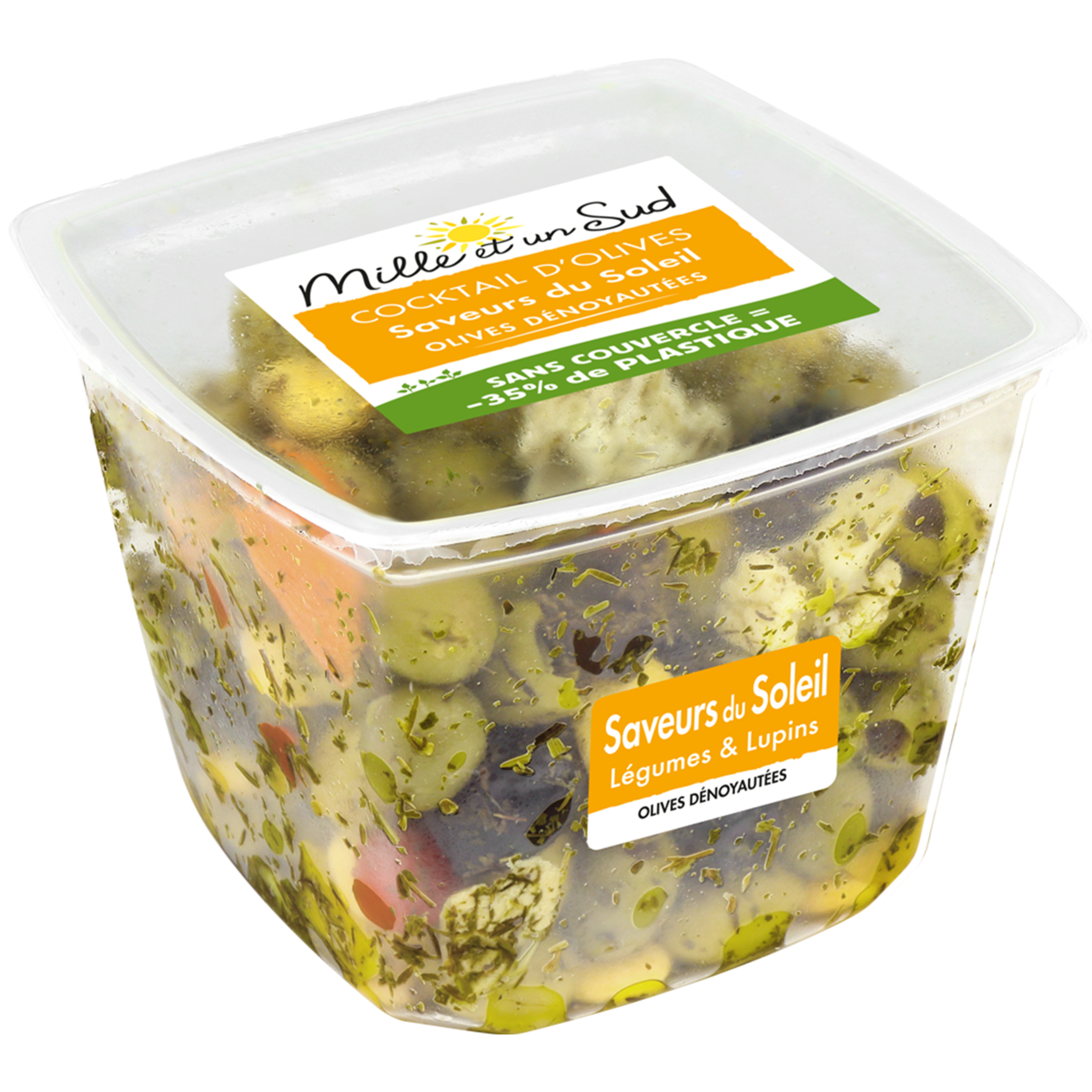 Des olives vertes et noires dénoyautées accompagnées de petits légumes et de lupins pour ensoleiller vos apéritifs.