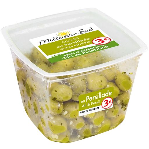 Ingrédients : Olives vertes cassées entières 96,8% (olives vertes, sel, acidifiant: acide lactique) (Maroc), huile de colza, ail 0,78%, persil flocon 0,02%, acidifiant: acidecitrique, conservateur: sorbate de potassium
