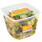 Ingrédients : Olives farcies pâtes de poivrons 26,9% (olives dénoyautées Manzanilla 19,4%, pâte de poivron 7,5% (poivrons, conservateur: sorbate de potassium,épaisissant: alginate de potassium, chlorure de calcium, gomme guar)) (Espagne), olives vertes dénoyautées 26% (olives vertes, sel, acidifiant: acidelactique)(Maroc), lupin 15,6%, variante de légumes 11,6% (cornichon, chou fleur 3,3%, carotte 3,3%, oignons 1,9%), olives noires confites dénoyautées8,3%, poivrons 5,8%, huile de colza, thym 0,5%, persil 0,2%, acidifiants: acide lactique, acide citrique, conservateurs: sorbate de potassium, acide acétique,stabilisant: gluconate ferreux