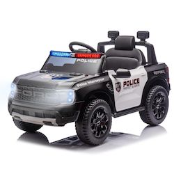 Marche arrière Suspension des roues arrière Vitesse : 3-5 km/h Éclairage avant à LED Éclairage du pare-brise : feux de police à LED bleus et rouges Mégaphone/« poire » : légère amplification de la voix Ouverture des portes Siège profilé (29,5 x 33 x 19,5 cm) Ceintures de sécurité Espace de chargement derrière le siège (38 x 10,5 x 16 cm) Chargeur Âge : 3 ans et plus Charge maximale : 30 kg Conforme aux normes de sécurité européennes Poids : 14,1 kg