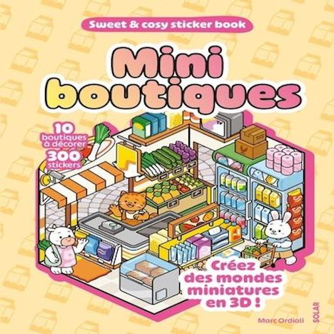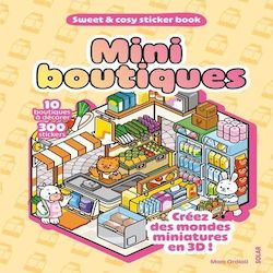 Créez des mondes miniatures en 3D ! Les stickers book cosy : une tendance régressive au succès croissant ! Nouvelle collection avec 10 scènes et 20 planches de stickers originaux à agencer Avec pages détachables Ouvrez ce joli carnet relié et découvrez : 10 formes de boutiques imprimées sur papier épais, à détacher 20 planches avec des mini stickers, sur fond transparent Les modèles des scènes finalisées pour vous guider Choisissez votre planche et décorez-la avec vos mini stickers pour construire une adorable scène en 3D ! Mini librairie, mini supermarché, mini pâtisserie... assemblez ces jolies boutiques une à une et animez-les avec d'adorables animaux cosy.