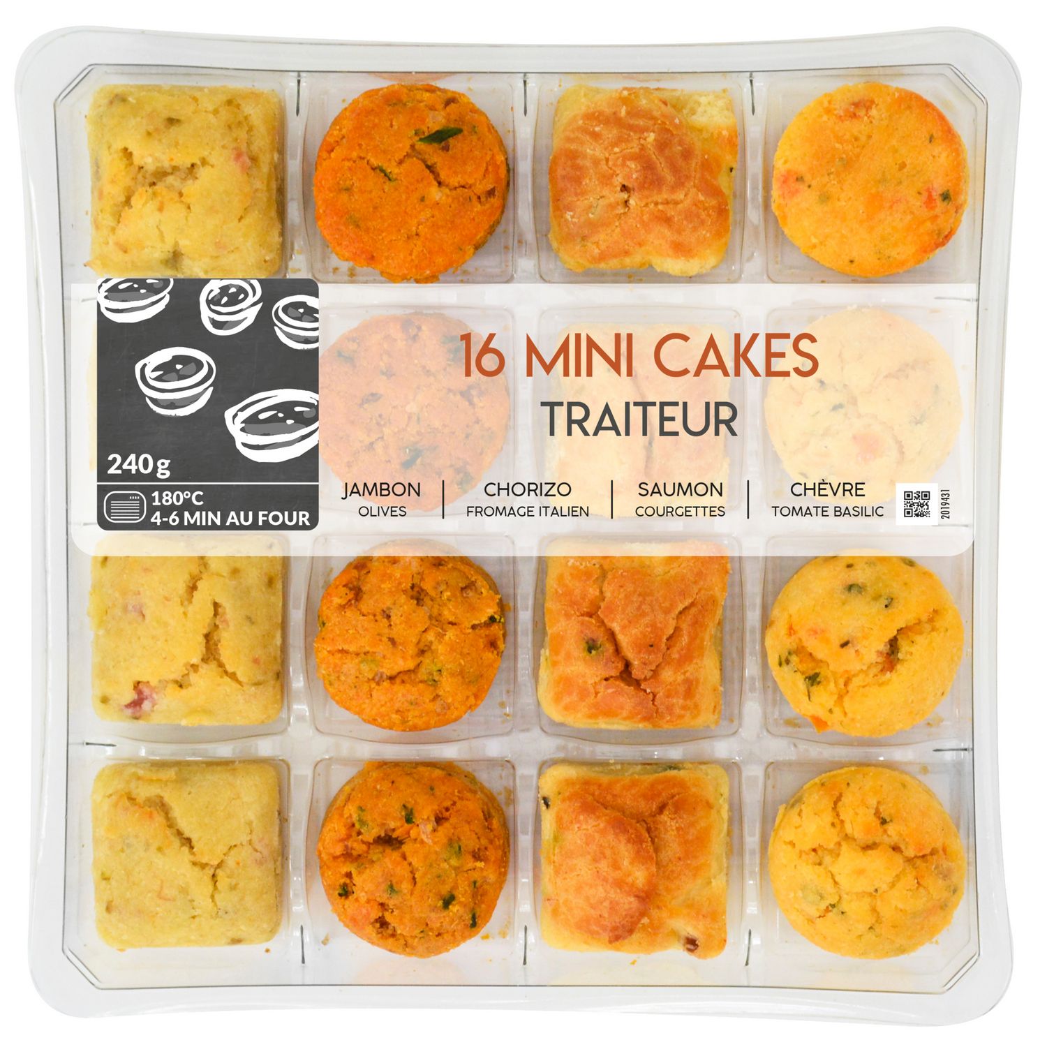 Ingrédients : Ingrédients : Mini cakes garnis de jambon cuit supérieur, d’emmental et d’olives vertes, décongelés : Farine de BLE, OEUFS, jambon cuit supérieur 14,3% (jambon de porc 13,1% (origine: France), sel, dextrose, arôme naturel, antioxydant: E316, conservateur: E250), EMMENTAL 8,1%, olives vertes 7,9% (olives vertes, eau, sel, acidifiant : acide lactique), CREME liquide, LAIT demi-écrémé, eau, huile de colza, poudres à lever : diphosphate disodique - carbonate acide de sodium, fibres de BLE, huile d'olive vierge extra, sel, poivre blanc.Mini cakes garnis de chorizo précuit, de fromage à pâte pressée cuite et de ciboulette, décongelés : Farine de BLE, OEUFS, chorizo précuit 13,9% (épaule, poitrine et lard de porc (origine : UE), sel, piment doux, LAIT en poudre, maltodextrine, dextrose, ail, épices), FROMAGE à pâte pressée cuite (origine : Italie) 11,4%, huile de colza, CREME liquide, LAIT demi-écrémé, ciboulette 3,2%, épices, poudres à lever : diphosphate disodique - carbonate acide de sodium, fibres de BLE, huile d'olive vierge extra, épices, sel.Mini cakes garnis de courgettes grillées, de saumon fumé et de zestes de citron, décongelés : Farine de BLE, OEUFS, courgettes grillées 15,6%, SAUMON fumé 14,1% (SAUMON atlantique (salmo salar), sel), huile de colza, CREME liquide, LAIT demi-écrémé, fibres de BLE, poudres à lever : diphosphate disodique - carbonate acide de sodium, huile d'olive vierge extra, zestes de citron 0,6%, sel, poivre blanc.Mini cakes garnis de fromage de chèvre, de tomates mi-séchées et de basilic, décongelés : Farine de BLE, OEUFS, FROMAGE de chèvre 15,2%, tomates mi-séchées 15,2%, huile de colza, CREME liquide, LAIT demi-écrémé, EMMENTAL, basilic 1,5%, poudres à lever : diphosphate disodique - carbonate acide de sodium, fibres de BLE, huile d’olive vierge extra, sel, poivre blanc.Traces éventuelles de crustacés, mollusques, soja, fruits à coque, moutarde et graines de sésame, céleri et autres céréales contenant du gluten.