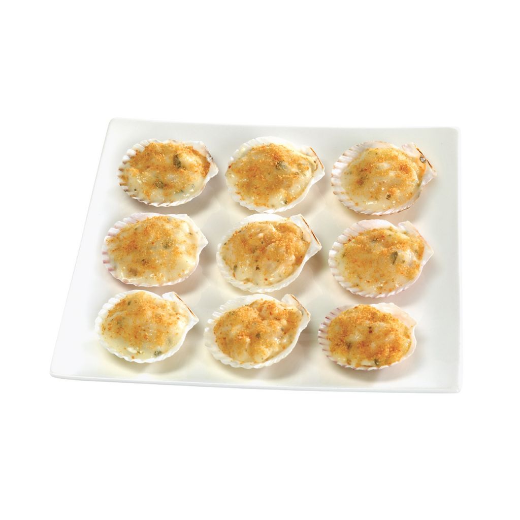 Coquilles garnies d'une préparation à base de noix de Saint-Jacques*, crème légère, oignons et vin blanc.
