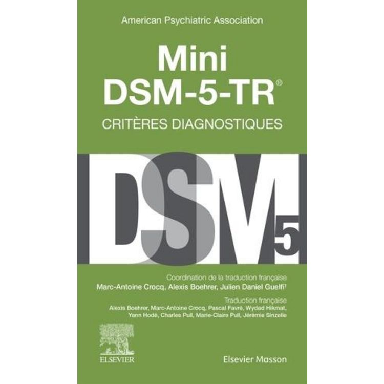 Le Mini DSM-5-TR est la version poche du DSM-5-TR Manuel diagnostique et statistique des troubles mentaux la référence incontournable en psychiatrie. Il reprend l'intégralité de la altification des troubles mentaux du DSM-5-TR en se concentrant sur les critères diagnostiques (liste et définitions des troubles sous-types spécifications et codes diagnostiques). Les modifications de structure et de critères de cette 5e édition - texte révisé sont indispensables pour tout professionnel concerné par la santé mentale. Cet ouvrage de référence au format réduit et très maniable permet un accès rapide à l'ensemble de la altification. En offrant une information diagnostique essentielle et des plus actualisées il permet de disposer d'une ressource incontournable pour diagnostiquer efficacement l'ensemble des troubles mentaux.