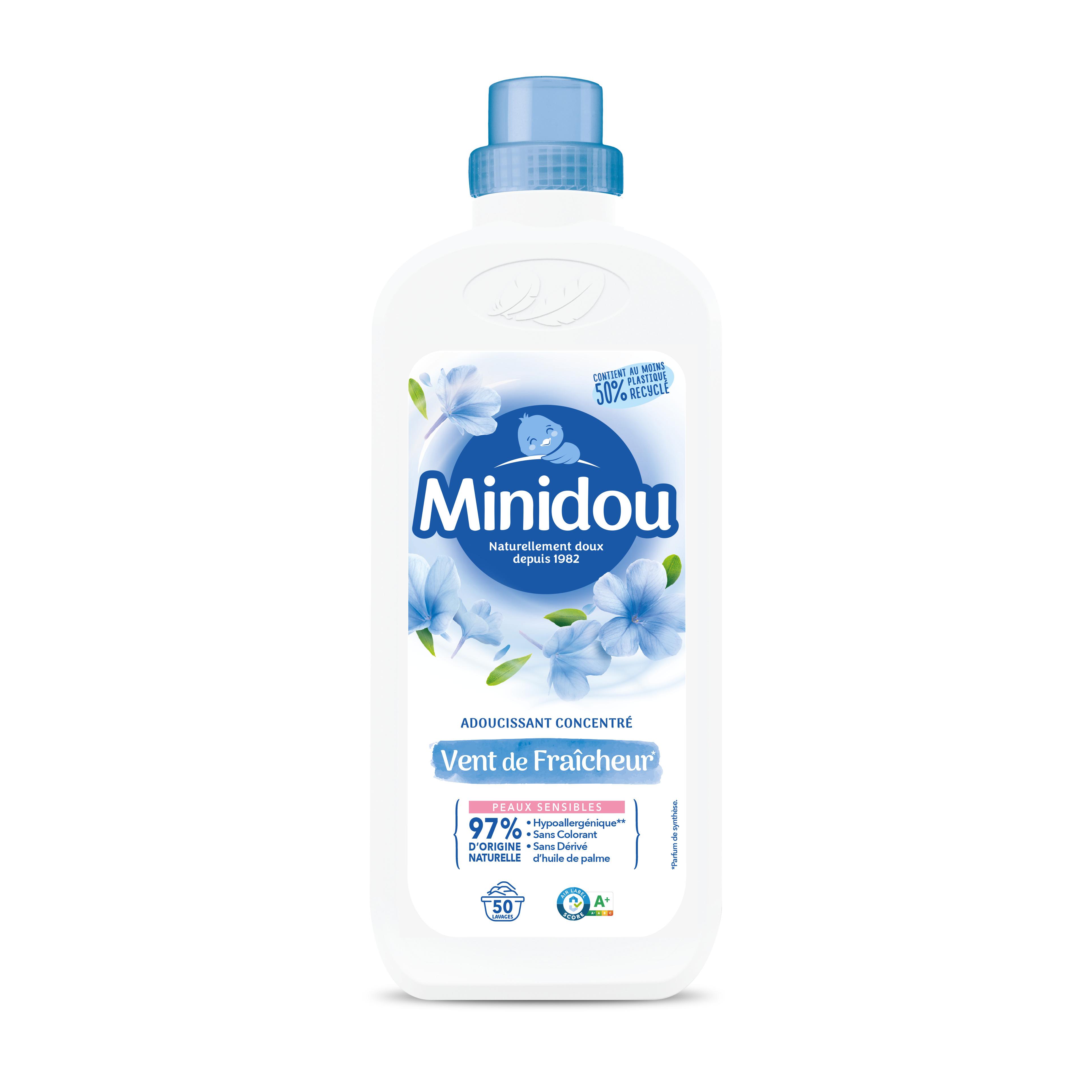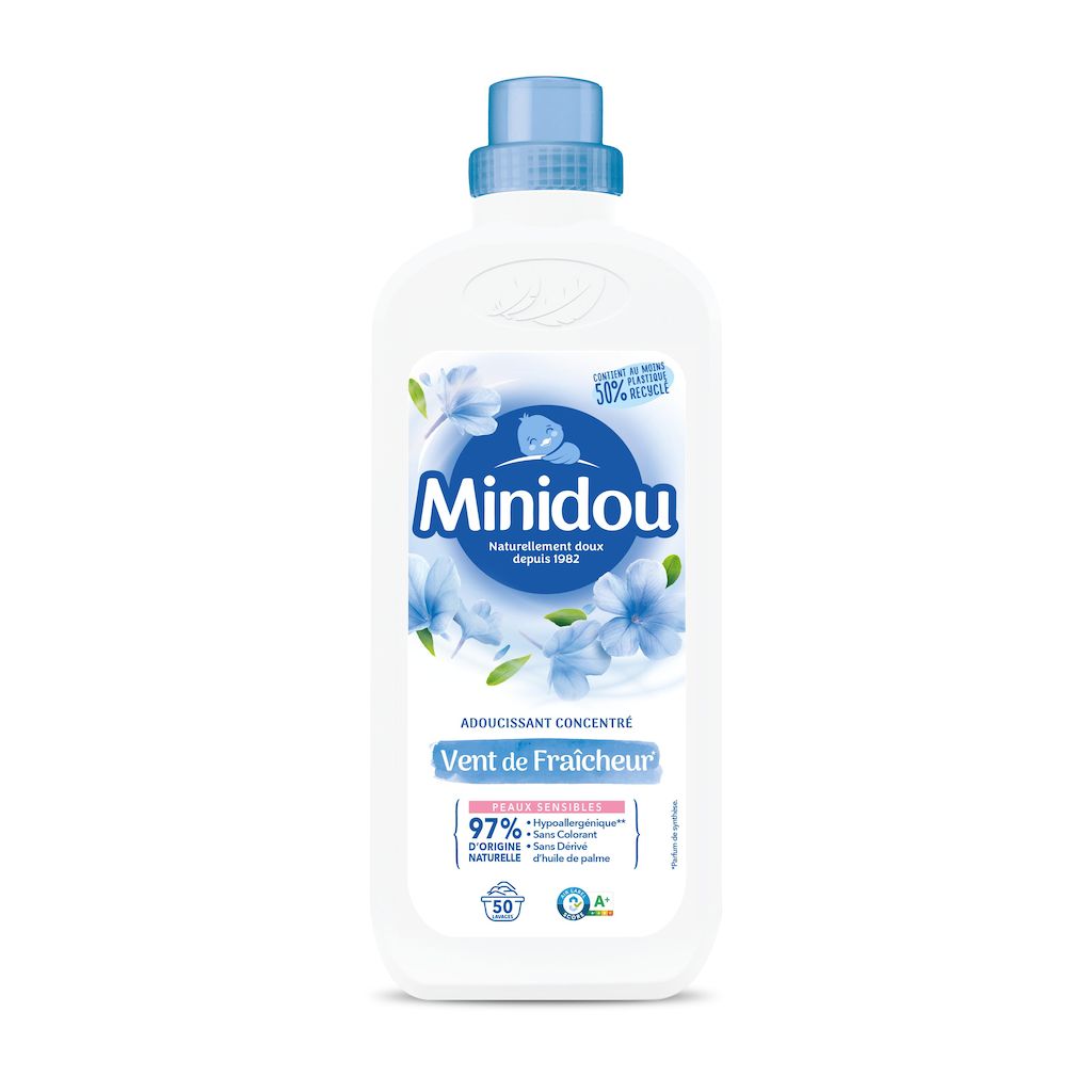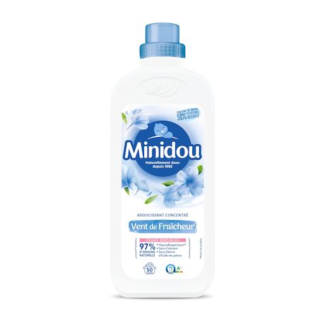 L’assouplissant Minidou Vent de Fraîcheur enveloppe votre linge d’un délicat parfum frais et envoûtant et lui assure un maximum de douceur. Sa formule hypoallergénique à 97% d’ingrédients d’origine naturelle est particulièrement respectueuse des peaux sensibles à tendance allergique. Minidou, le plus doux des adous.