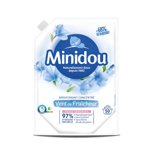 L’assouplissant Minidou Vent de Fraîcheur enveloppe votre linge d’un délicat parfum frais et envoûtant et lui assure un maximum de douceur. Sa formule hypoallergénique à 97% d’ingrédients d’origine naturelle est particulièrement respectueuse des peaux sensibles à tendance allergique. Son format Doypack permet le réduction de 63% de plastique (vs un flacon de même contenance). Minidou, le plus doux des adous
