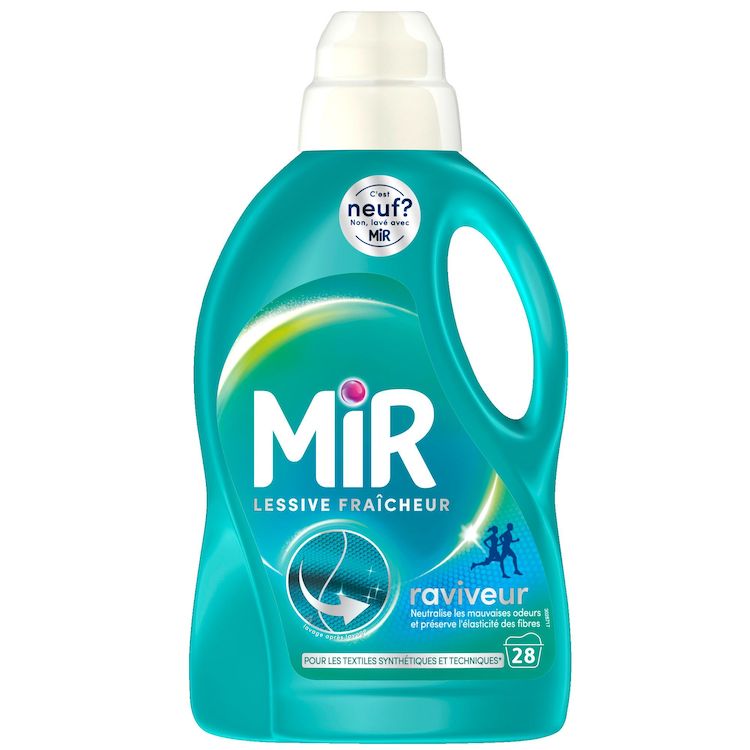 Mir Lessive préserve vos textiles synthétiques lavage après lavage et les fait durer plus longtemps pour des vêtements comme neufs ! MIR fraîcheur neutralise les mauvaises odeurs et préserve la technicité des fibres. Une formule unique 3-en-1 qui préserve l'élasticité et la technicité des fibres synthétiques, neutralise durablement les mauvaises odeurs avec son parfum frais et ravive l'intensité des couleurs. C'est neuf ? Non, lavé avec Mir ! Couleurs - ravive l'intensité des couleurs