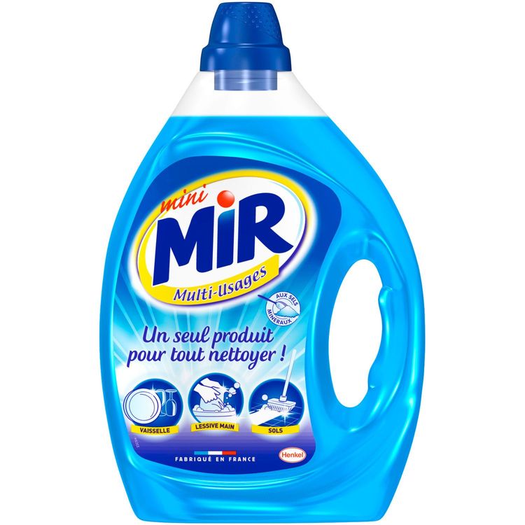 Mini Mir, mini prix, mais il fait le maximum ! Mini Mir Multi-Usages est le produit indispensable pour tout nettoyer dans votre maison : vaisselle, surface de votre cuisine et de votre salle de bain. Sols (carrelage, surfaces plastiques) et murs lavables. Linge : lavage main tous textiles. Pensez-y aussi à l'extérieur : voiture, véol, meubles de jardin, toiles cirées.