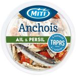 Ingrédients : Filets d’ANCHOIS 59.5% (Engraulis encrasicolus) (filets d’ANCHOIS, vinaigre d’alcool, sel, acidifiant : acide citrique), huile de tournesol, tomates cocktail mi-séchées aux herbes surgelées (tomates cocktail, huile de tournesol, sel, ail, origan), ail 0.9%, persil déshydraté 0.2%, poivre.Traces possibles de : Crustacés, mollusques, SULFITES, gluten, graines de sésame, lait, amandes