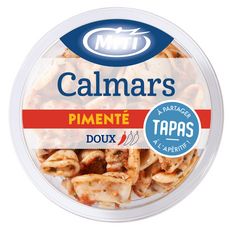 Ingrédients : CALMARS 64% (Loligo spp.) (CALMARS, sel, acidifiants : E331 et E330, vinaigre d'alcool), huiles végétales (tournesol, olive), vinaigre d’alcool, sel, ail déshydraté, persil déshydraté, piment fort 0.7%, paprika moulu fumé.