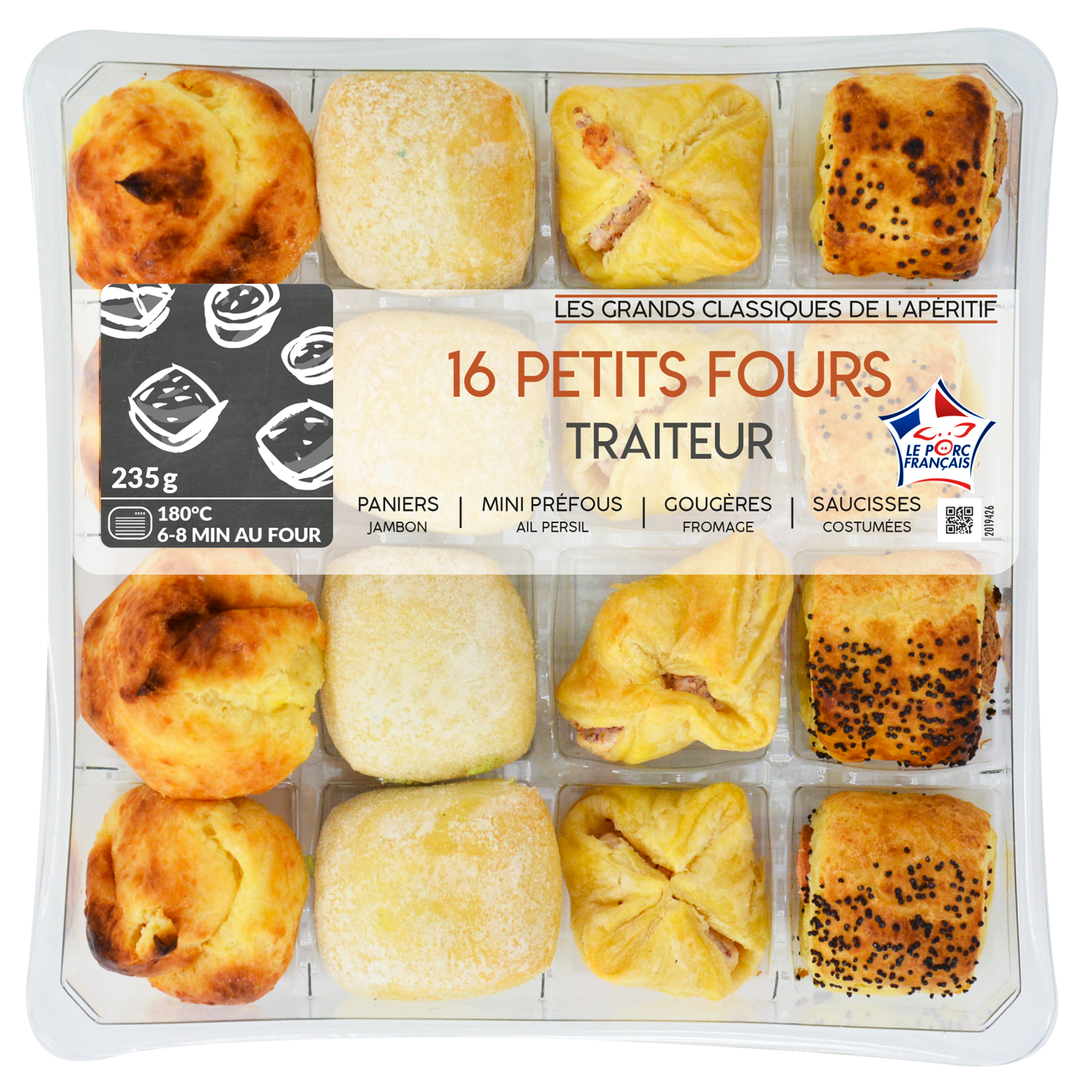Ingrédients : 4 Pâtes feuilletées garnies de jambon cuit supérieur, d’oignons, d’ail et de ciboulette, décongelées : Pâte feuilletée 70,5% (farine de BLE, BEURRE, eau, sel), garniture 23,5% (LAIT demi-écrémé, CREME liquide, jambon blanc cuit supérieur 4,4% (jambon de porc 4% (origine : France), sel, dextrose, arôme naturel, antioxydant : érythorbate de sodium, conservateur : nitrite de sodium), EMMENTAL, oignons 1,2%, ail 0,7%, amidon modifié de maïs, ciboulette 0,5%, huile de colza, sel, épaississant : méthylcellulose, poivre blanc), dorure (jaune d'OEUF, LAIT demi-écrémé).4 Pains spéciaux cuits et farinés garnis d’une préparation à base d’ail et de persil, décongelés : Pain spécial cuit 75% (farine de BLE 48,3%, eau, huile d'olive vierge extra, levure de panification, sel), BEURRE, CREME liquide pasteurisée, ail 2,9%, persil 0,9%, sel, arôme naturel de poivre. 4 Gougères au fromage, décongelées : préparation pour choux 24,6% (farine de BLE, CREME en poudre, jaune d'OEUF, blanc d'OEUF, sel, sucre, épice), EMMENTAL 24,6%, LAIT demi-écrémé pasteurisé, eau, OEUFS, BEURRE, sel, arôme naturel de poivre, muscade).4 Saucisses de Strasbourg roulée dans une pâte feuilletée à la moutarde de Dijon et recouverte de graines de pavot, décongelées : Pâte feuilletée 51,7% (farine de BLE, BEURRE, eau, sel), saucisse de Strasbourg 44,7% (viande de porc 31,3% (origine : France), eau, gras de porc, sel, dextrose, épices, stabilisants : triphosphates, arômes, colorants : extrait de paprika - carmins, antioxydant : érythorbate de sodium, conservateur : nitrite de sodium), dorure (jaune d’OEUF, LAIT demi-écrémé pasteurisé), MOUTARDE de Dijon 1,1% (eau, graines de MOUTARDE, vinaigre d’alcool, sel), graines de pavot 0,9%.Traces éventuelles de crustacés, mollusques, poissons, soja, fruits à coque, céleri, graines de sésame et autres céréales contenant du gluten.(% exprimés sur chaque petit four)