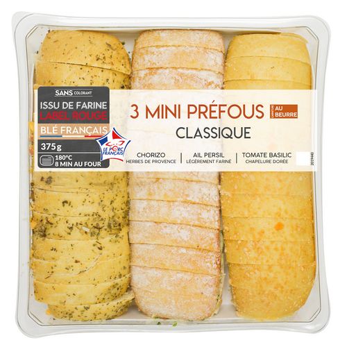 Ces mini-pains Préfou à l’huile d’olive n’ont rien à envier à leur grands frères : Un assortiment de 3 recettes savoureuses , Chorizo , Ail et persil et Tomates basilic et tellement plus pratique grâce à ces petites bouchées apéritives ! Un plateau qui passe au four !