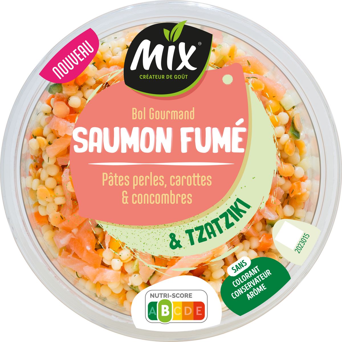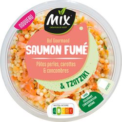 Mix vous a préparé un bol gourmand préparé avec des pâtes parles, des allumettes de saumon, un mélange de carottes et de concombres sur une base de tzatzíki pour plus de gourmandise et de plaisir lors de vos pauses.
