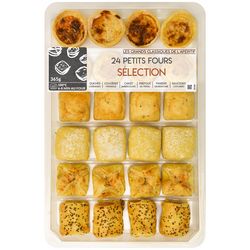 Ingrédients : Pâtes brisées garnies d'un appareil à quiche, d'emmental, de lardons cuits fumés et de jambon cuit supérieur, décongelées : Garniture 60,9% (OEUFS, CREME liquide pasteurisée, LAIT demi-écrémé pasteurisée, EMMENTAL 8,1%, lardons fumés cuits 6,8% (poitrine de porc (origine : France), eau, sel, dextrose, conservateurs: E316-E250), jambon cuit supérieur 6,8% (jambon de porc (origine : France), sel, dextrose, arôme naturel, antioxydant : E316, conservateur : E250), amidon modifié de pomme de terre, sel, arôme naturel de poivre), pâte brisée 39,1% (farine de BLE, BEURRE, eau, sel, colorant : caroténoïdes).Gougères au fromage, décongelées : préparation pour choux 24,6% (farine de BLE, CREME en poudre, jaune d'OEUF, blanc d'OEUF, sel, sucre, épice), EMMENTAL 24,6%, LAIT demi-écrémé pasteurisé, eau, OEUFS, BEURRE, sel, arôme naturel de poivre, muscade. Mini cakes garnis de jambon cuit supérieur, d'emmental et d'olives vertes, décongelés : Farine de BLE, OEUFS, jambon cuit supérieur 14,3% (jambon de porc 13,1% (origine: France), sel, dextrose, arôme naturel, antioxydant: E316, conservateur: E250), EMMENTAL 8,1%, olives vertes 7,9% (olives vertes, eau, sel, acidifiant : acide lactique), CREME liquide, LAIT demi-écrémé, eau, huile de colza, poudres à lever : diphosphate disodique - carbonate acide de sodium, fibres de BLE, huile d'olive vierge extra, sel, poivre blanc.