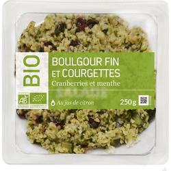 Salade de boulgour fin, de courgettes, de cranberries et de menthe, au jus de citron concentré, issue de l’agriculture biologique Salade de boulgour fin, de courgettes, de cranberries et de menthe, au jus de citron concentré, issue de l’agriculture biologique