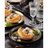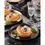 Coquille garnie de riz long cuit, de noix de Saint-Jacques* cuites, de champignons de Paris, de Parmigiano Reggiano, de brisures de truffes noires et recouverte d'un décor en pâte feuilletée.