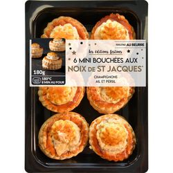 Croûte à bouchée en pâte feuilletée (40%) garnie d’une sauce (53,3%) aux noix de Saint-Jacques*, aux champignons de Paris, à l’ail et au persil, recouverte d’un chapeau en pâte feuilletée (6,7%), décongelée