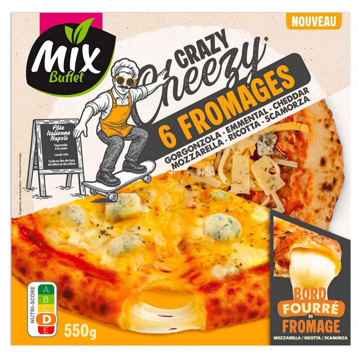 Pâte à pizza au bord fourré de fromages et garnie de sauce tomate, de cheddar, de mozzarella, d’emmental et de gorgonzola.