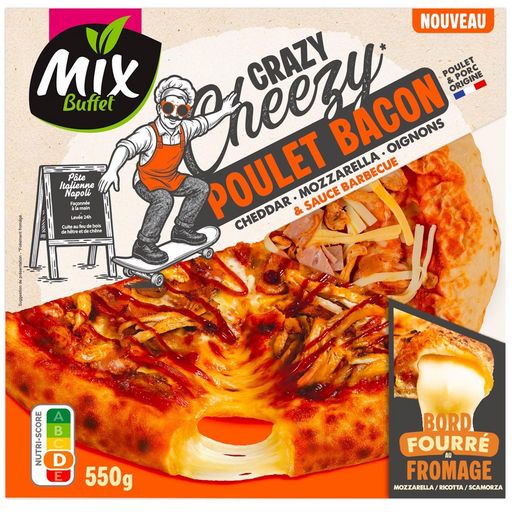 Ingrédients : SELECTION DES MEILLEURS INGREDIENTS :370 g de Pâte à pizza au bord fourré de fromages (67,3%) : pâte 46,1% (farine de BLE tendre, eau, sel, levure), garniture au FROMAGE 20% (SCAMORZA fumée 11,4%, RICOTTA 3,3%, eau, MOZZARELLA 1,8%), huile de tournesol.95 g de Garniture d’Ingrédients savoureux (17,3%) : viande de poulet effilochée cuite 4,7% [viande de poulet 4,6% (origine : France), sel], CHEDDAR 4,5% (LAIT pasteurisé, sel, ferments LACTIQUES, coagulant microbien, colorant : caroténoïdes), MOZZARELLA 4,5%, bacon cuit fumé choix 1,8% [viande de porc 1,7% (origine : France), sel, sirop de glucose, arôme de fumée, arômes naturels, ferments], oignons préfrits 0,9% (oignons, huile de tournesol), jus concentré de poivron rouge, piment doux, plantes aromatiques, sel, poivre noir.70 g de Sauce tomate (12,7%) : purée de tomates 11,3%, eau, sel, amidon de maïs.1 sachet de 15g de sauce condimentaire barbecue (2,7%) : eau, purée de tomate concentrée 0,6%, sucre, vinaigre d'alcool, amidon, sel, paprika fumé, caramel (sucre, eau), arôme fumée, ail. Traces éventuelles de crustacés, œuf, poissons, soja, fruits à coque, moutarde, graines de sésame, mollusques et autres céréales contenant du gluten.