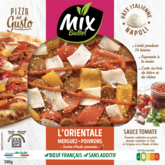 Pizza garnie de sauce tomate cuisinée, poivrons grillés, merguez précuite pelée, mozzarella et d’une sauce tomate épicée (2,6%), accompagnée d’un sachet de préparation culinaire à base d’huile de colza et d’extrait de piment.