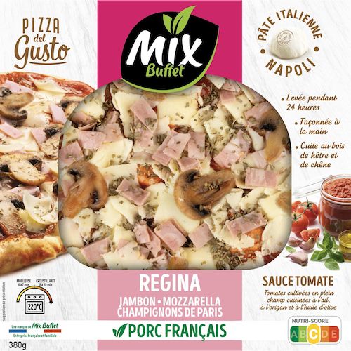 Pizza garnie de sauce tomate cuisinée à l’huile d’olive vierge extra (0,2%), de mozzarella, de jambon cuit supérieur, de champignons de Paris et d’origan.