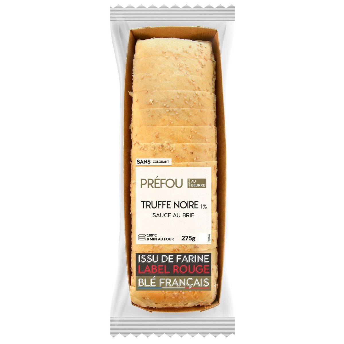 Ingrédients : Pain spécial cuit 67,2% (farine de BLE 40,5% (farine de BLE, farine de BLE malté), eau, huile d’olive vierge extra, levure de panification, sel, GRAINES DE SESAME), BEURRE 16,5%, sauce au BRIE 9,7% (BRIE 6,8%, eau, BEURRE, LAIT écrémé en poudre, amidon, sel), CREME liquide, brisures de truffes noires 1,3% (truffe noire 1%, jus de truffes noires, eau, sel), huile de pépins de raisin aromatisée (huile de pépins de raisin, arôme), sel, poivre.Traces éventuelles de crustacés, oeuf, poissons, soja, fruits à coque, céleri, moutarde, mollusques et autres céréales contenant du gluten.