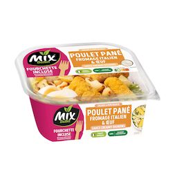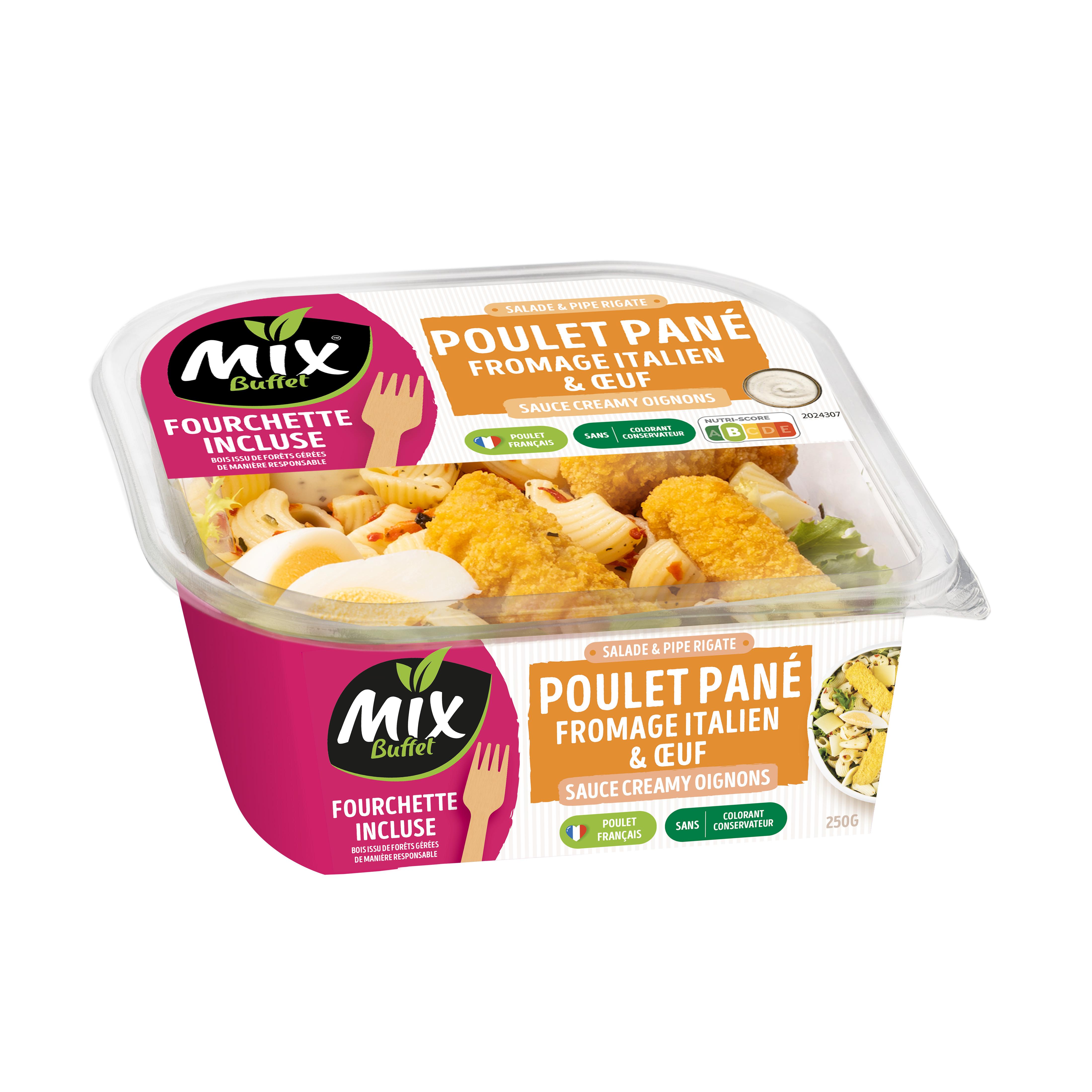 Ingrédients : 108,5 g de Pipe rigate cuisinées (43,4%) : pâtes alimentaires Pipe rigate cuites 40,1% (eau, semoule de BLE dur de qualité supérieure), huile de colza, tomates déshydratées, basilic 0,4%, ail, sel.76,5 g d’Ingrédients Savoureux (30,6%) : préparation à base de viande de poulet traitée en salaison, aromatisée, panée, frite et cuite 18% [viande de poulet 5,9%, eau, chapelure (farine de BLE, levure, sel, épices), huile de tournesol, peau de volaille, farine de BLE, GLUTEN DE BLE, fibre de BLE, sel, arômes, dextrose, antioxydant : érythorbate de sodium], OEUFS durs 9% (OEUFS, eau, sel), FROMAGE à pâte pressée cuite 3,1% (origine Italie).40 g de Salades mélangées (16%) : laitue, chicorée et roquette.25 g de Sauce à la crème et aux oignons, aromatisée (10%) : eau, huile de colza, jaune d’OEUF, CREME fraîche 0,4%, sucre, vinaigre d’alcool, sel, amidon modifié, oignons 0,05%, acidifiant : acide lactique, ciboulette, oignons déshydratés 0,02%, épaississant : gomme xanthane, ail, arôme naturel, poivre.La salade composée peut contenir des traces de crustacés, mollusques, poissons, soja, moutarde, graines de sésame, fruits à coque et autres céréales contenant du gluten.La sauce peut contenir des traces de céleri.