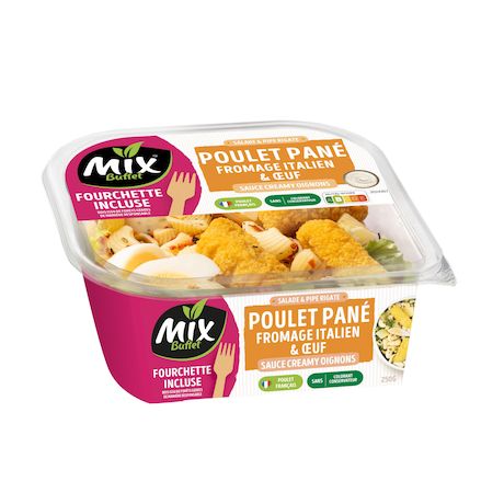 Salade composée de pâtes alimentaires cuisinées, de salades en mélange, de préparation à base de viande de poulet traitée en salaison, aromatisée, panée, frite et cuite, d'oeufs durs, de fromage à pâte pressée cuite et de basilic, accompagnée d'une sauce à la crème et aux oignons, aromatisée.