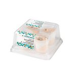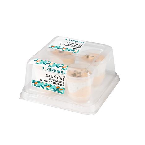 Verrines garnies de fromage, de saumon Atlantique cuit, de concombres et de saumon Atlantique fumé.