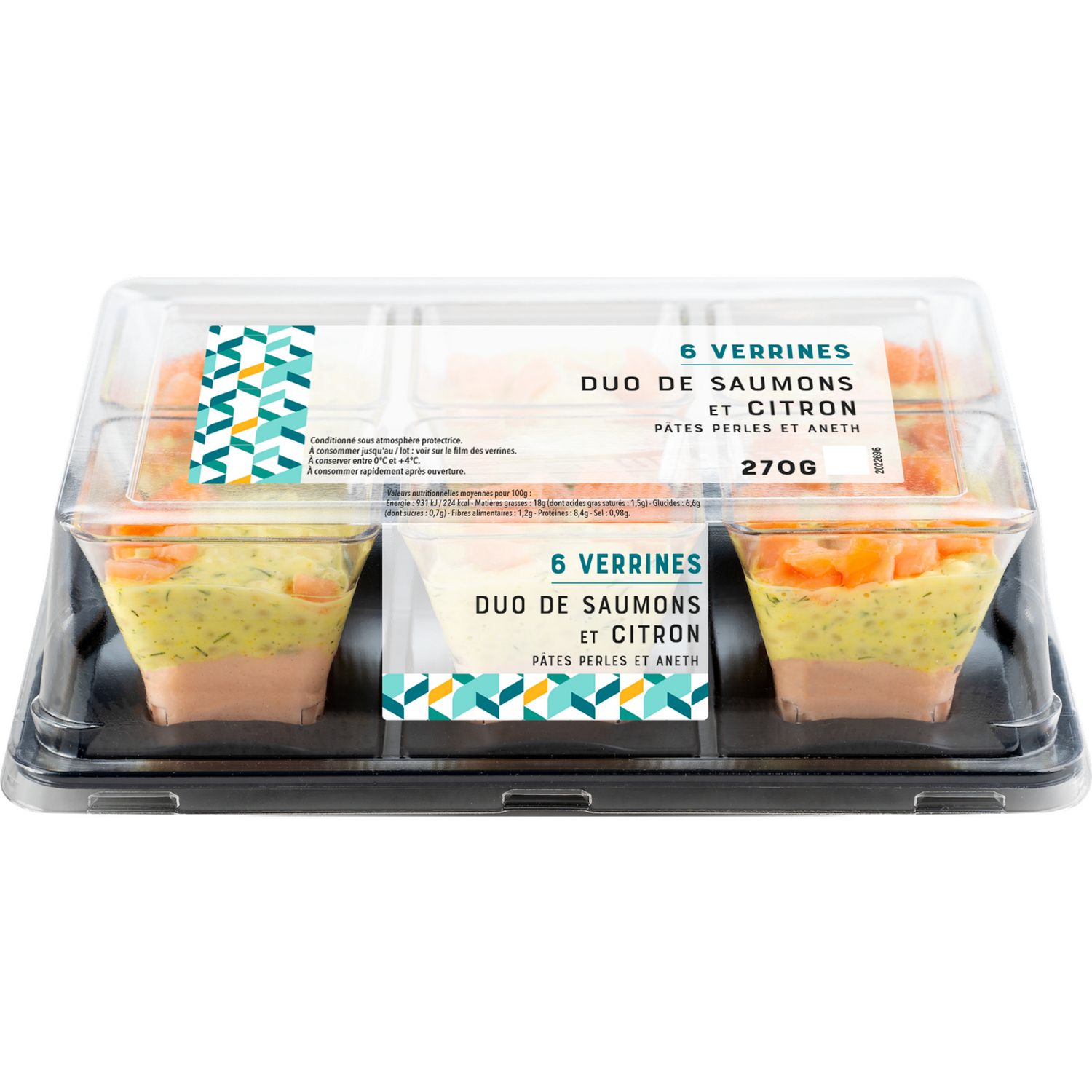Ingrédients : Pâtes alimentaires perles aux OEUFS cuites 26,8% (eau, semoule de BLÉ dur, OEUFS), SAUMON cuit 20,5% (SAUMON Atlantique Salmo salar, sel), huile de colza, eau, FROMAGE blanc 0% de matières grasses, concombres, SAUMON fumé 6,6% (SAUMON Atlantique Salmo salar, sel), vinaigre d’alcool, MOUTARDE de Dijon (eau, graines de MOUTARDE, vinaigre d’alcool, sel), jaune d’OEUF, jus de citron concentré 0,5%, sel, aneth 0,3%, citron confit 0,1%, ciboulette, épices, épaississant : gomme xanthane, huile de tournesol.Traces éventuelles de crustacés, mollusques, soja, fruits à coque, céleri, graines de sésame et autres céréales contenant du gluten.En raison de la présence de saumon, malgré toutes les précautions prises et nos contrôles, il se peut qu’exceptionnellement une arête subsiste dans le produit.