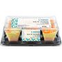 Verrines garnies de pâtes alimentaires cuites, de saumon Atlantique cuit, de saumon Atlantique fumé, de jus de citron concentré, d’aneth et de citron confit.