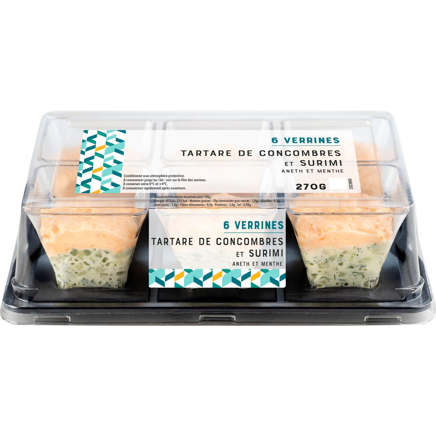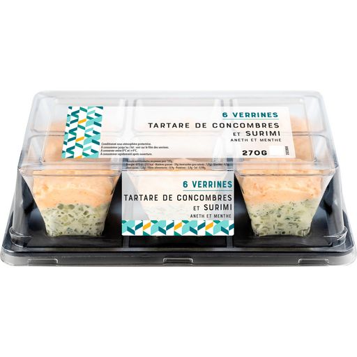 Ingrédients : Concombres 41,3%, surimi 23% (eau, chair de POISSON 8%, fécule de pomme de terre, amidon de BLÉ, blanc d'OEUF réhydraté, huile de colza, sucre, sel, arôme naturel (contient POISSONS et CRUSTACÉS), colorant : extrait de paprika), huile de colza, eau, FROMAGE blanc 0% de matières grasses 2,7%, CRÈME liquide, jaune d’OEUF, vinaigre d’alcool, MOUTARDE de Dijon (eau, graines de moutarde, vinaigre d’alcool, sel), sel, aneth 0,2%, épaississant : gomme xanthane, sucre, menthe 0,1%, jus de citron concentré, colorant : extrait de paprika.Traces éventuelles de mollusques, soja, fruits à coque, céleri, graines de sésame et autres céréales contenant du gluten.