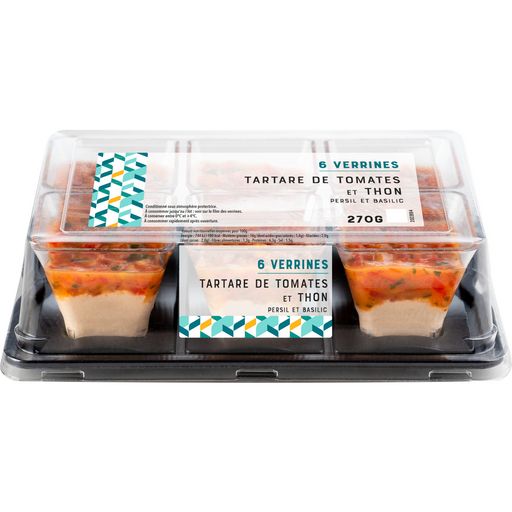 Verrines garnies de tomates, de thon Listao, de tomates mi-séchées, de persil et de basilic.