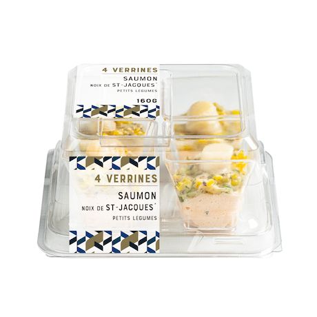 Verrines garnies de saumon Atlantique, de carottes, de concombres et de noix de Saint Jacques*, aromatisées.