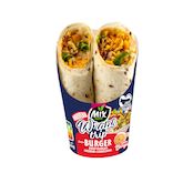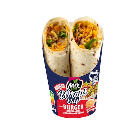 Wrap trip façon Burger composé de bœuf français, de cheddar, de cornichons et d'une sauce burger.