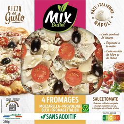 Mix vous a préparé une délicieuse pizza avec une pâte Napoli aux saveurs inimitables et une sauce tomate cuisinée ! Associée à 4 fromages fondants, un vrai régal à partager !