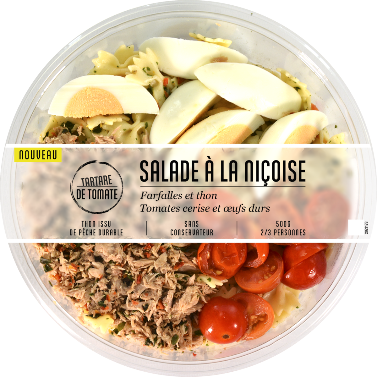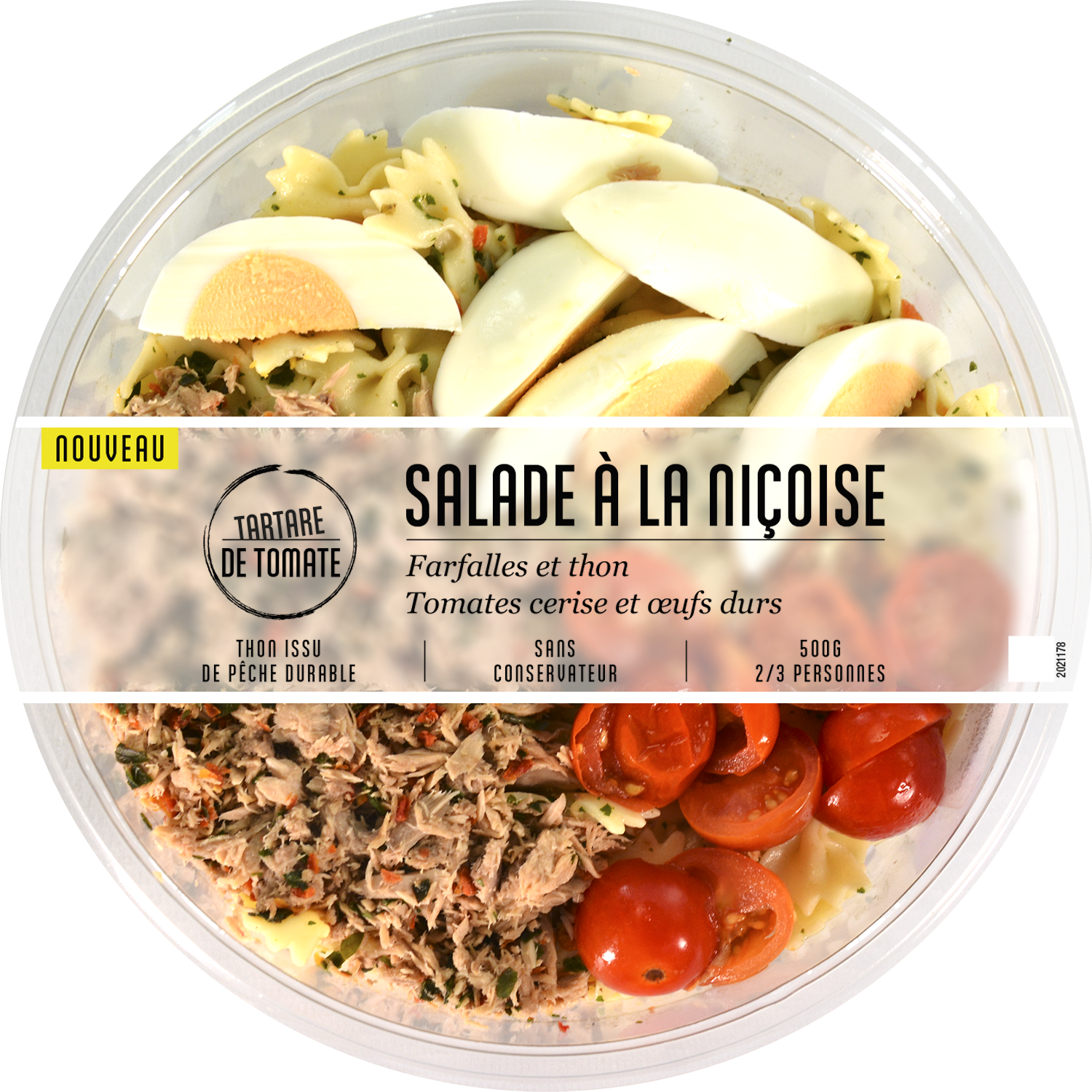 Salade composée de pâtes alimentaires, mélange de tomates et tomates mi-séchées (20%), thon Listao, tomates cerise et oeufs durs.