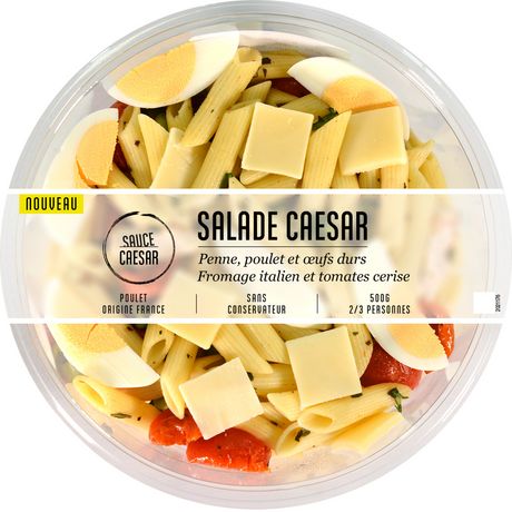 Ingrédients : Pâtes alimentaires penne cuites 46% (eau, semoule de BLE dur de qualité supérieure), tomates cerises 16,8%, émincés de filet de poulet traité en salaison rôti 8% (filet de poulet (origine : hors UE), amidons, dextrose, sel), OEUFS durs 8%, FROMAGE, huile de colza, eau, FROMAGE à pâte pressée cuite 2% (origine Italie), FROMAGE blanc 0% de matière grasse, jeunes pousses d’épinard émincées, vinaigre d’alcool, PARMIGIANO REGGIANO 0,7%, purée de câpres 0,7% (câpre, sel, vinaigre, correcteur d’acidité : acide acétique), basilic, jaune d’OEUF, huile de tournesol, sel, persil, extraits de volailles, graisse de poulet, arômes, maltodextrine, MOUTARDE de Dijon (eau, graines de MOUTARDE, vinaigre d’alcool, sel), amidon modifié de pomme de terre, ail, épices, épaississant : gomme xanthane, jus de citron concentré.Traces éventuelles de crustacés, poissons, soja, fruits à coque, graines de sésame, mollusques et autres céréales contenant du gluten.