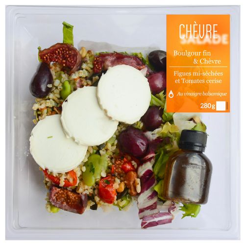 Salade composée de boulgour fin, de salades en mélange, de fromage de chèvre, de raisins, de tomates cerises mi-séchées marinées (4,1%), de figues noires mi-séchées, de noix, de tomates mi-séchées marinées (1,2%) et accompagnée d’une sauce vinaigrette au vinaigre balsamique.