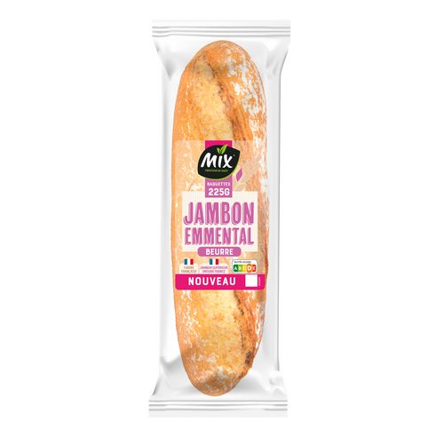 Mix vous a préparé un sandwich baguette, avec un pain fabriqué avec de la farine française, pétri et cuit dans notre atelier breton. Une recette généreusement garnie de jambon cuit supérieur et d'emmental pour plus de gourmandise et de plaisir lors de vos pauses.
