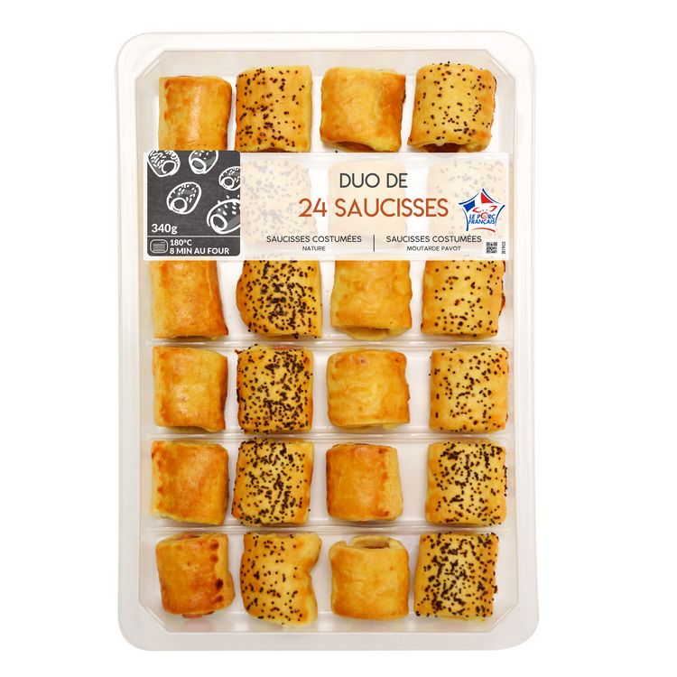 Ingrédients : Ingrédients :12 Saucisses de Strasbourg roulées dans une pâte feuilletée, décongelées : pâte feuilletée 52,8% (farine de BLE, BEURRE, eau, sel), saucisse de Strasbourg 45,6% (viande de porc 31,9% (origine : France), eau, gras de porc, sel, dextrose, épices, stabilisants : triphosphates, arômes, colorants : extrait de paprika - carmins, antioxydant : érythorbate de sodium, conservateur : nitrite de sodium), dorure (jaune d’OEUF, LAIT demi-écrémé pasteurisé).12 Saucisses de Strasbourg roulées dans une pâte feuilletée à la moutarde et recouvertes de graines de pavot, décongelées : Pâte feuilletée 51,7% (farine de BLE, BEURRE, eau, sel), saucisse de Strasbourg 44,7% (viande de porc 31,3% (origine : France), eau, gras de porc, sel, dextrose, épices, stabilisants : triphosphates, arômes, colorants : extrait de paprika - carmins, antioxydant : érythorbate de sodium, conservateur : nitrite de sodium), dorure (jaune d’OEUF, LAIT demi-écrémé pasteurisé), MOUTARDE de Dijon 1,1% (eau, graines de MOUTARDE, vinaigre d'alcool, sel), graines de pavot 0,9%.Traces éventuelles de crustacé, poisson, soja, fruits à coque, céleri, graines de sésame, mollusque, autres céréales contenant du gluten