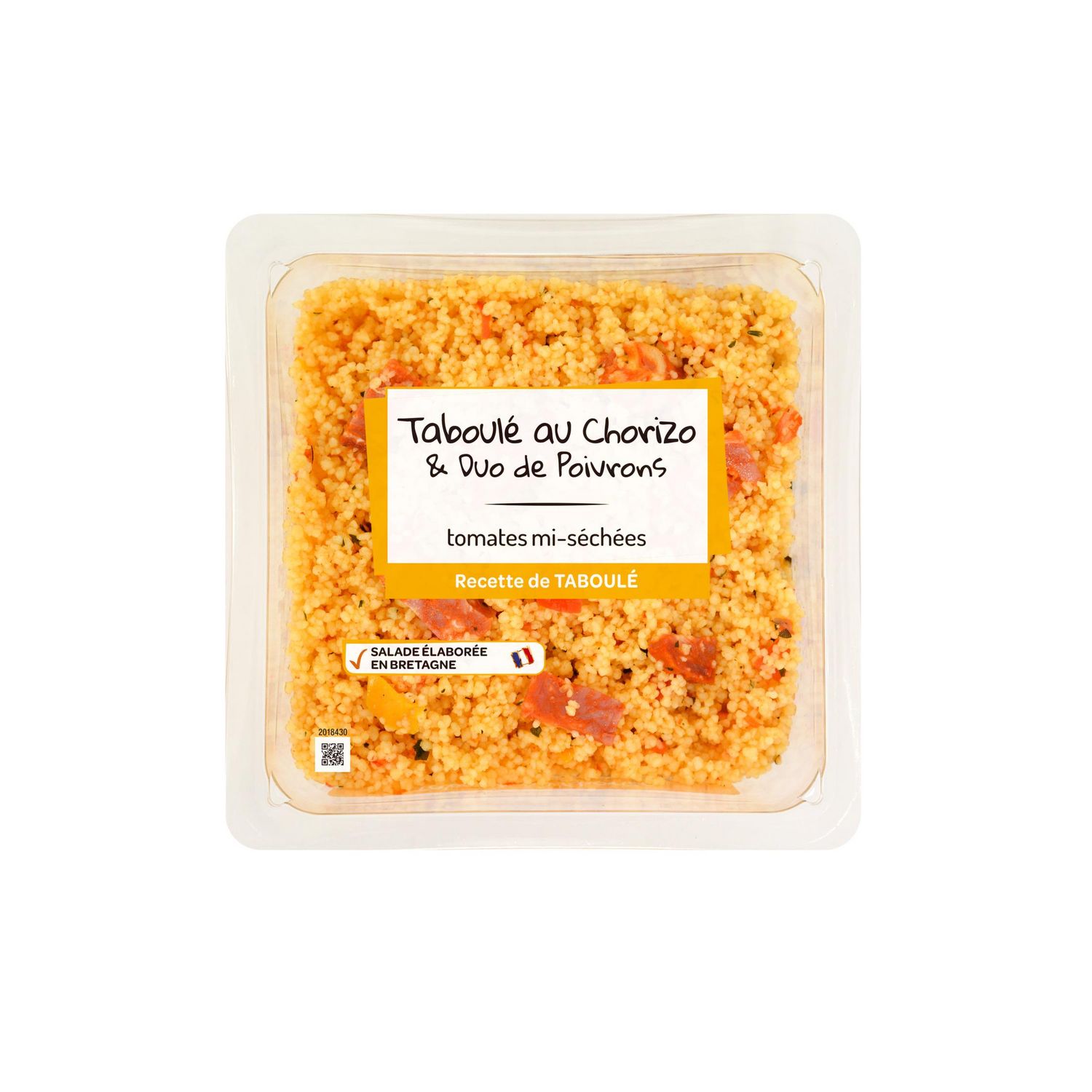 Ingrédients : Semoule de BLE dur réhydratée 50,1%, poivrons 10%, huile de colza, chorizo doux 8% (viande de porc, sel, piment doux, LAIT en poudre, maltodextrine, dextrose, ail et épices), tomates 6%, eau, vinaigre d’alcool, préparation culinaire surgelée à base de poivron rouge 2,5% (poivrons, huile de tournesol, jus de citron à base de concentré, sel, sucre, herbes de Provence, ail, poivre noir), tomates mi-séchées marinées 2% (tomates, huile de tournesol, sel, plantes aromatiques), vinaigre de Xérès, huile d’olive vierge extra, sel, plantes aromatiques, MOUTARDE de Dijon (eau, graines de MOUTARDE, vinaigre d’alcool, sel), épices, épaississant : gomme xanthane.Traces éventuelles de crustacés, oeuf, poissons, soja, fruits à coque, céleri, graines de sésame, mollusques et autres céréales contenant du gluten.